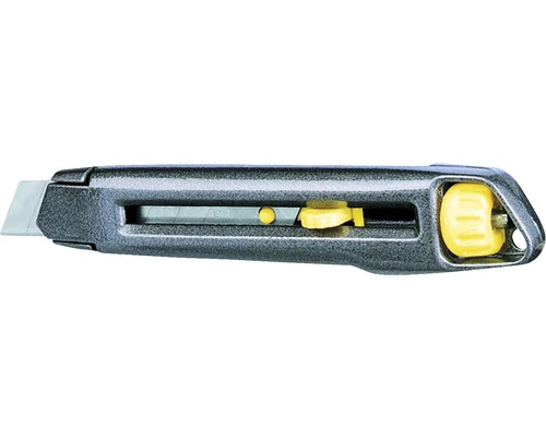 Afbreekmes in metalen uitvoering, duurzaam en licht. Het mes heeft de InterLock neusverbinding: hierdoor kan snijmesje, ook onder grote kracht, niet naar boven gedrukt worden. Er is geen extra gereedschap nodig om van mes te wisselen.