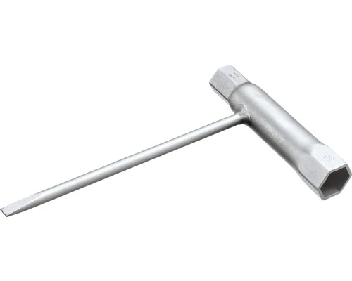 Combinatie van bougiesleutel met haaks daarop een schroevendraaier voor sleufkopschroeven.